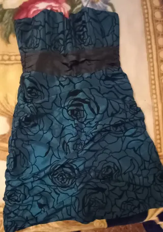 Elegante vestido de fiesta con detalles que lo hacen único. - Tirantes finos. - Cuerpo fruncido en la parte superior. - Fajín de terciopelo negro con lazo. - Falda con volantes y adornos. Talla 44 pero la talla no corresponde a la talla real.