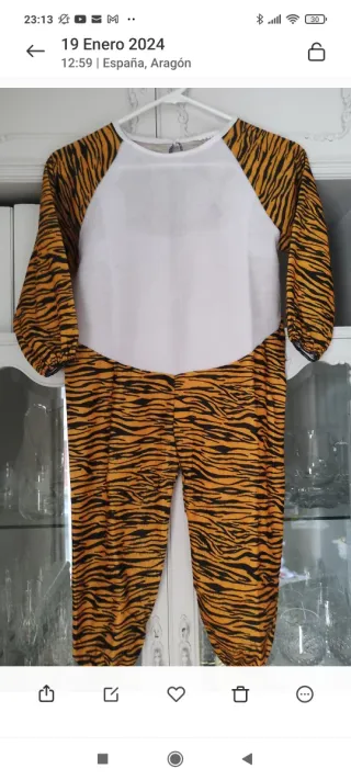 Disfraz infantil con estampado de tigre, ideal para fiestas o juegos. - Mangas y pantalón con diseño de rayas de tigre. - Parte superior blanca. - Talla única.