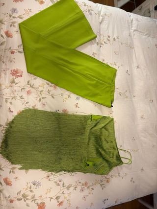 Conjunto de dos piezas en color verde lima, ideal para eventos especiales. La parte superior es asimétrica y cuenta con una cascada de flecos que le da mucho movimiento. El pantalón es de corte recto. T.M (38-40) - Colección Cápsula. - Marca: Mango.