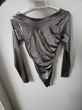 Body fiesta mujer plateado con fruncidos laterales y escote en la espalda. Incluye botones en la parte de abajo. PRECIO NEGOCIABLE - Tela fina y cómoda. - Mangas largas. - Tejido brillante.
