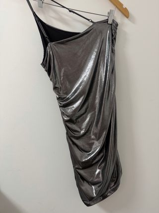 Vestido de fiesta con un llamativo acabado plateado. Su diseño asimétrico y drapeado lo hacen ideal para eventos especiales. - Diseño de un solo hombro. - Detalle drapeado. - Tirantes ajustables.