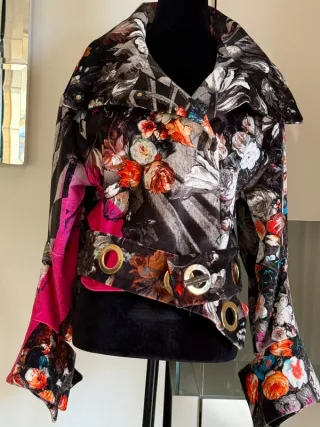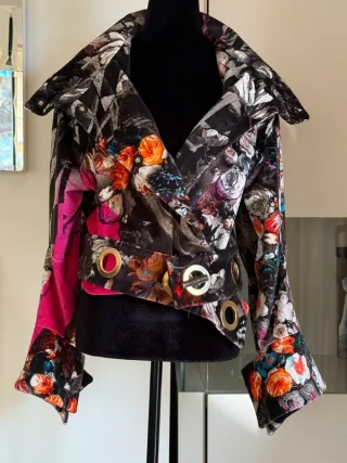 Abrigo Javier Vicente (alta confección española), una pieza auténtica de colección, con entre 25 y 40 años de antigüedad. Conservado en muy buenas condiciones, este abrigo es una obra de diseño con textura en relieve, juego de capas y patrón artístico que mezcla piel sintética, terciopelo y tejido estructurado. Una prenda con presencia, carácter y un estilo de lujo vintage que hoy es casi imposible de encontrar. Por el tipo de etiqueta, el patrón de confección y el diseño escultórico propio de la moda española de alta costura de finales de los 80 y principios de los 90, la prenda corresponde aproximadamente al periodo 1985–1995.