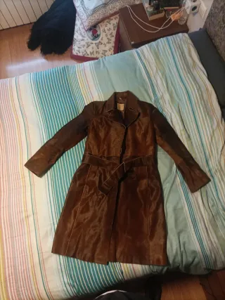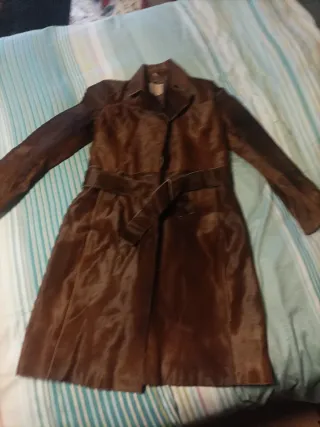 Elegante abrigo de piel con cinturón. - Material: Piel potro - Color: Marrón - Diseño: Abrigo largo con cinturón para ajustar la cintura. Puesto una vez , sin uso conserva brillo original y sin desgaste.