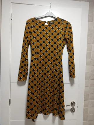 Vestido de manga larga con un llamativo estampado geométrico. marca Surkana - Diseño con círculos negros y detalles verdes. - Base en tono mostaza. - Cuello redondo con abertura.