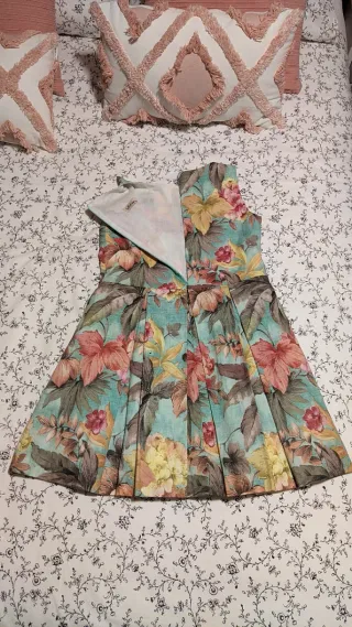 Vestido infantil con un bonito estampado floral, ideal para ocasiones especiales de la marca La Ormiga, talla 12. - Diseño sin mangas. - Falda con pliegues. - Tejido ligero y fresco. Se ha usado solamente un día, para una comunión.