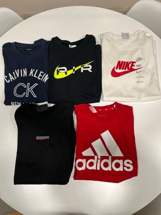 Todas las camisetas verdaderas. TALLAS: - Talla S calvin klein. - Talla XL (niño) nike negra. - Talla XL (niño) nike blanca. - Talla XS mckenzie. - Talla 13-14 años adidas roja. Camisetas todas en perfecto estado apenas sin uso la mayoria.