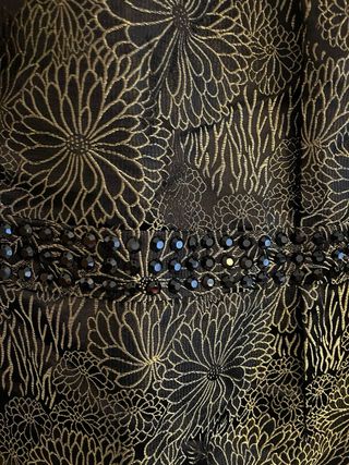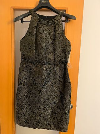 Elegante vestido de fiesta con un estampado floral en dorado sobre negro. Ideal para ocasiones especiales. - Diseño sin mangas con cuello halter. - Cintura adornada con pedrería. - Cremallera en la espalda.
