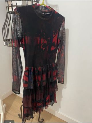 Vestido de malla con un estampado floral y detalles plisados. Talla S. - Con cinturilla elástica. - Mangas largas. - Falda con volantes en cascada.