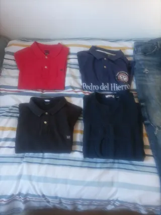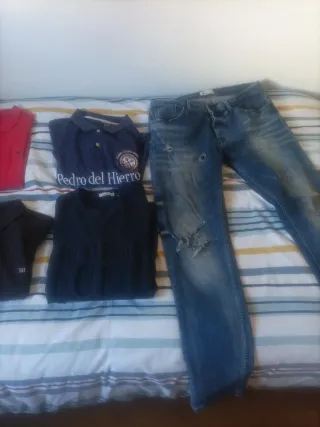 Conjunto de prendas de vestir para hombre de la marca Pedro del Hierro. - Camisa polo azul con logo. - Camisa polo roja. - Jersey azul marino. - Pantalón vaquero desgastado.