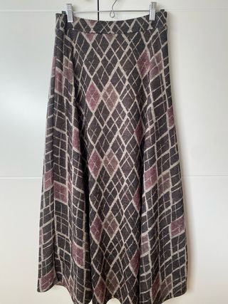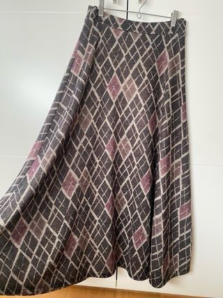 Falda midi con un bonito estampado de rombos en tonos marrones y morados. Su diseño de capa le da un movimiento muy elegante. Talla unica, con goma en la cintura. Genero de punto muy agradable. - Estampado de rombos. - Diseño de capa. Largo: 87 cm. Muy cómoda de llevar.