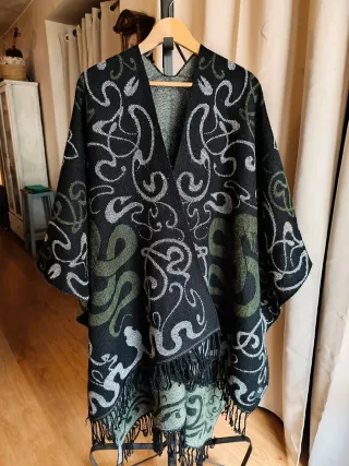 Capa estilo poncho con un diseño inspirado en Harry Potter. Es una prenda versátil y cómoda. Marca Original Harry Potter, diseño exclusivo de EMP, tienda Alemana. Impecable. Se el orgullo de Tu Casa Mágica con este elegante atuendo. - Diseño con motivos de serpientes de la Casa Slithering en negro, verde y plateado. - Acabado con flecos en el borde inferior. - Tejido suave y agradable al tacto.
