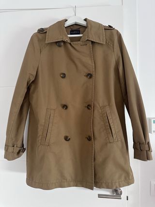 Gabardina de la marca CAROLL en color camel. Un clásico atemporal para cualquier ocasión. - Diseño de doble botonadura. - Cuello con solapas. - Dos bolsillos frontales. - Puños ajustables con botón.