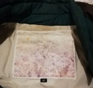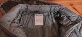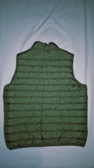 Plumífero con un diseño moderno y funcional. - Exterior en color ocre - Interior en color verde. - Cuello ancho y envolvente. - Cierre de cremallera. Tiene una pequeña mancha blanca en una manga, se puede ver en la última foto