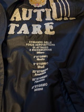Chaqueta fina de la marca Aeronautica Militare. - Diseño con detalles en blanco y rojo. - Cuello y puños con rayas. - Cremallera frontal.