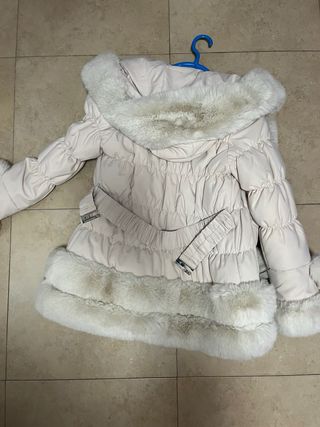 Elegante abrigo con un diseño moderno y detalles de pelo. - Capucha con pelo. - Puños con pelo. - Cinturón ajustable. - Bolsillos con cremallera. Marca local