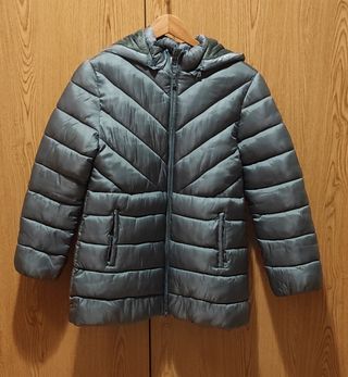 Chaquetón largo de invierno muy calentita para chica, talla 16 (162 cm) de la marca Mayoral. Diseño acolchado con líneas en zigzag, capucha integrada y desmontable, dos bolsillos frontales con cremallera oculta. Color azul verdoso metalizado. Material Poliéster. Medidas: larog de hombro a parte baja 73 cm; ancho debajo de las axilas 48 cm; ancho parte baja 56 cm.