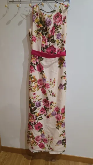 Elegante vestido largo con estampado floral. Ideal para eventos o fiestas. - Diseño sin mangas. - Cinturón a juego. - Largo hasta los tobillos.