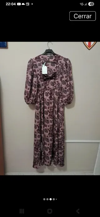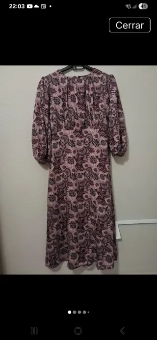 vestido de la marca Polín et Moi. fuerte inspiración nostálgica, ideal para quienes buscan un look bohemio o de "invitada perfecta" con un toque clásico. Vestido largo con estampado floral en tonos rosa y burdeos. Su diseño destaca por los siguientes elementos: - Corte bajo pecho, elástico por detras , una falda con caída fluida. - Cuello y espalda: Tiene un sofisticado diseño de cuello alto y un detalle de abertura tipo "keyhole" en la parte posterior, complementado con un lazo de terciopelo. permite usar sujetador porque lo cubre el lazo. Mangas: Son mangas abullonadas que terminan en puño elástico, 3/4. Pecho de 90 a 106