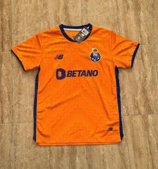 Camiseta de fútbol con un diseño moderno y llamativo. - Cuello redondo. - Manga corta. - Escudo del equipo bordado. - Logo de la marca visible.