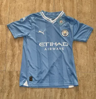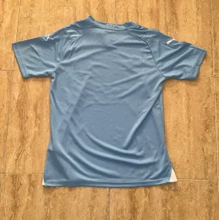 Camiseta de fútbol del Manchester City. - Diseño con cuello en V y detalles de rayas. - Escudo del club y logo de la marca. - Patrocinador principal en el frontal.