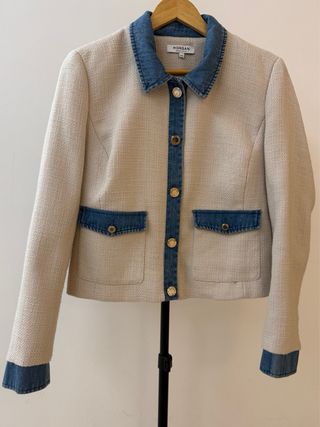 Elegante chaqueta de la marca Morgan, perfecta para un look sofisticado. - Combinación de tejido marfil y detalles en denim. - Cierre de botones. - Bolsillos frontales con solapa de denim. - Cuello de solapa con ribete de denim. - Puños con detalle de denim.