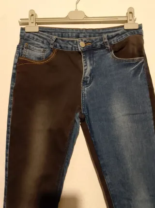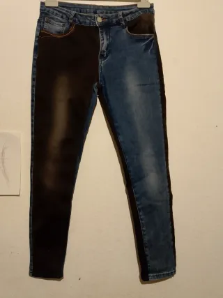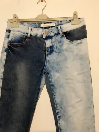 Vaqueros elástico único con un diseño bicolor llamativo, combinando tonos azules. Medidas: cintura 76 cm aprox, cadera 87 cm aprox y largo 91 cm - Diseño dividido en dos colores. - Estilo moderno y original.