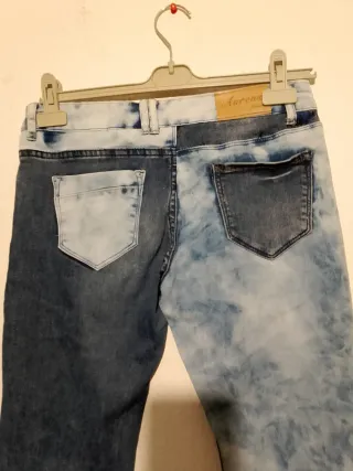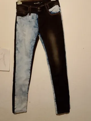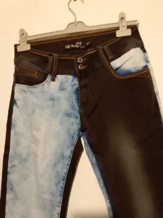 Vaqueros elástico únicos con un diseño bicolor llamativo y original. Medidas: cintura 76 cm aprox, cadera 87 cm aprox y largo 91 cm. - Combinación de azules - Estilo moderno y único.