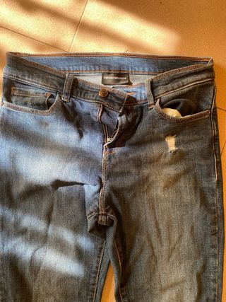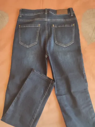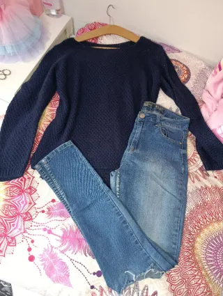 Conjunto de ropa de mujer. Usado pero en buen estado general, los vaqueros tienen algunas marcas de uso que se pueden ver en las fotos , también están las medidas - Jersey de punto azul marino con detalle caldo en la parte de atrás. Talla L - Vaqueros pitillo de tiro alto con rotos en las rodillas. Talla 40