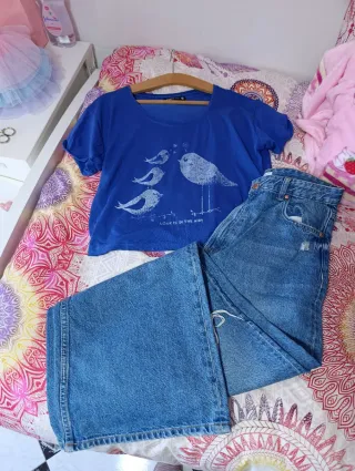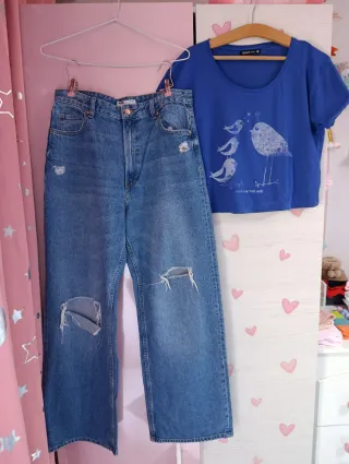 Conjunto de ropa de mujer. - Camiseta azul con estampado de pájaros en efecto desgastado, es cortita y amplia, por eso aunque marca talla M es como una L, - Vaqueros de pata ancha con rotos en las rodillas y no son nada elásticos, marca talla cuarenta y dos pero son bastante justos a mi parecer de cintura y cadera, hay medidas en las fotos