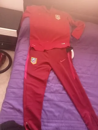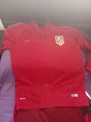Chándal del Atlético de Madrid temporada 2016/2017 - Sudadera con cuello alto y media cremallera. - Pantalón con detalles laterales. - Escudo del club bordado en ambas prendas. - Logo de la marca visible.