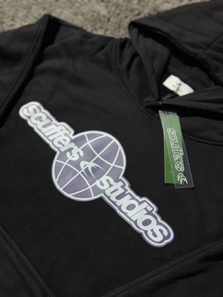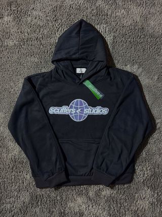 Sudadera con capucha de Scuffers Studios en color negro. Presenta un diseño gráfico en el frontal con un globo terráqueo y el nombre de la marca. - Diseño gráfico frontal. - Con capucha. - Bolsillo tipo canguro.