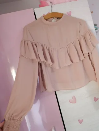 Blusa elegante de manga larga con un diseño de volantes. Color rosa vieja - beige Es cortita y talla amplia, como para una talla L, hay medidas en las fotos..( en la etiqueta marca talla M pero es amplia, comprobar medidas porfavor) - Cuello redondo. - Puños elásticos. - Cierre en la parte trasera.