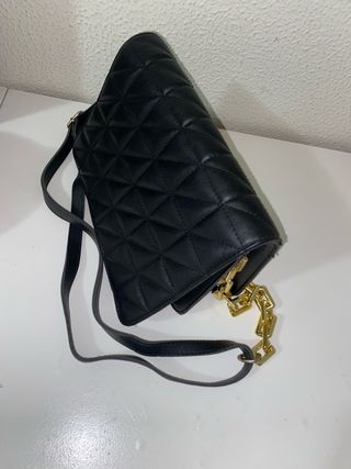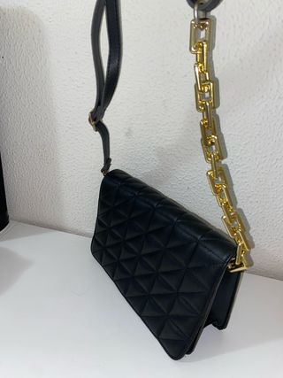 Bolso negro acolchado con un diseño elegante y una cadena dorada. - Acolchado con patrón de rombos. - Cadena metálica dorada. - Cierre de solapa, con cremallera dentro.