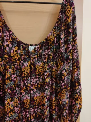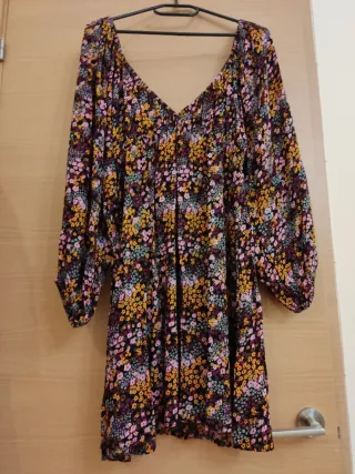 Vestido de la marca Roxy con un estampado floral vibrante y mangas largas. - Diseño con escote en V. - Estampado multicolor sobre fondo oscuro. - Mangas abullonadas.