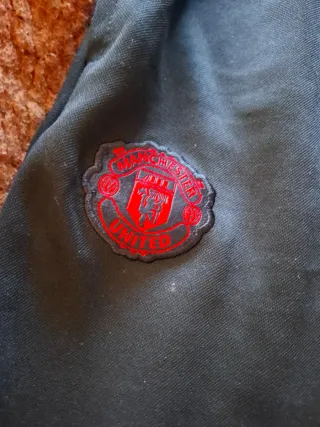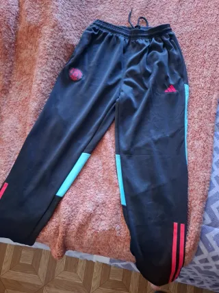 Pantalón de chándal del Manchester United con detalles deportivos. Marca L pero es una S - Diseño con el escudo del club. - Logo de Adidas. - Paneles laterales de color azul claro. - Rayas rojas en la parte inferior de las perneras.