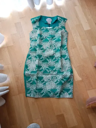 Elegante vestido de la marca ALMATRICHI con un bonito diseño de encaje. - Color verde con detalles en blanco. - Corte sin mangas y escote cuadrado. - Talla 40 (L).