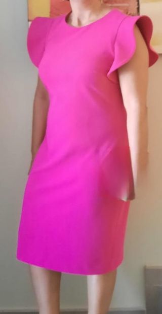 Vestido de la marca Calvin Klein, color fuscia, usado una sola vez. - Diseño elegante con mangas acampanadas. - Largo hasta la rodilla.