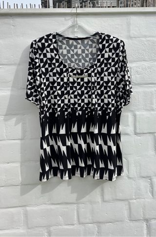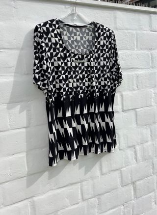 Blusa elegante, camiseta ✨✨ Perlas en el delantero dos pequeñas tablas que salen del escote. Estampado en blanco y negro Talla 48 ¿XL? ancho 55cm, largo 66cm Como nueva Marca Fierro Sport