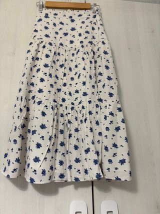 Falda midi de la marca Sezane con un bonito estampado floral. - Diseño con abertura lateral. - Estampado de flores azules sobre fondo beige. - Tejido ligero y fluido. Usada un dia