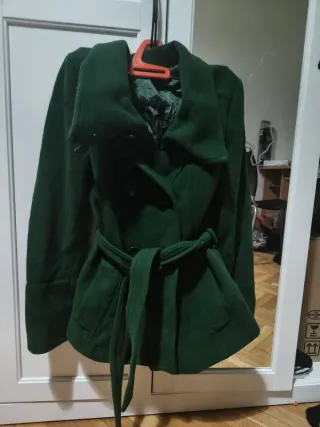 Abrigo corto de la marca Zara en color verde. Presenta un diseño elegante con cinturón. - Cuello amplio. - Cierre cruzado. - Cinturón para ajustar a la cintura. - Puños anchos.