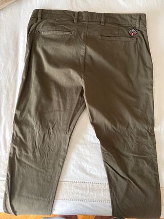 Pantalones chinos de verano de la marca Schott en color verde oliva. Perfectos para un look casual y fresco.Talla 33, largo metido para talla 30 - Diseño de corte recto. - Bolsillos delanteros y traseros. - Cierre de cremallera y botón.