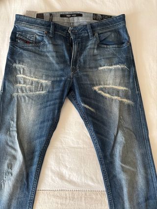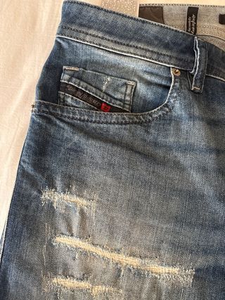 Pantalón vaquero de la marca Diesel con un estilo moderno y desgastado. Talla 33. Largo 30 - Diseño con rotos y zonas desgastadas. - Tono azul clásico.