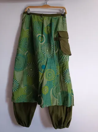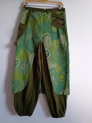 Pantalón de la marca Samar kanda con un diseño vibrante y original. - Estampado geométrico en tonos verdes y azules. - Cintura con trabillas y botones decorativos. - Bolsillos laterales. - Corte holgado con bajo ajustado.
