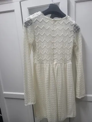 Vestido blanco con un delicado diseño de encaje. - Manga larga. - Escote redondo con detalle. - Largo hasta la rodilla. - Cierre de cremallera en la espalda.