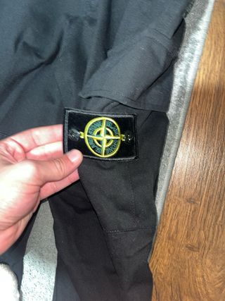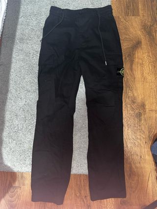 Pantalón cargo de la marca Stone Island en color negro y talla S. Diseño moderno y funcional. - Cierre con cordón ajustable en la cintura. - Bolsillos cargo laterales. - Parche distintivo de la marca en el bolsillo. PRECIO NEGOCIABLE