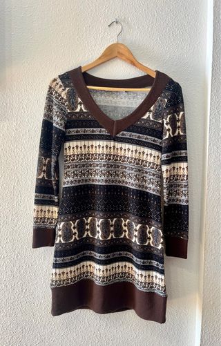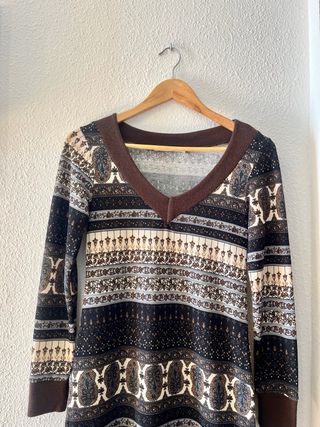 Vestido de media manga con un estampado étnico y detalles en marrón y beige. - Cuello en pico. - Diseño de rayas y motivos. - Bajo y puños en color marrón.