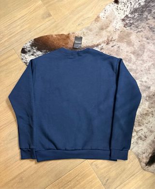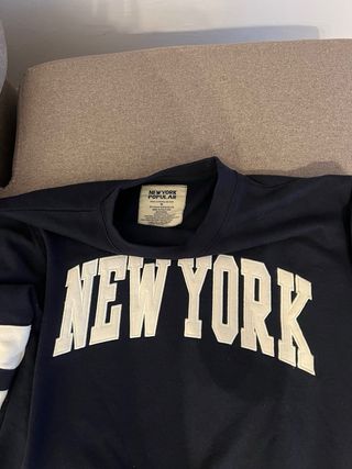 Jersey / sudadera sin capucha OVERSIZE de color azul oscuro con letras en color crema NEW YORK y detalles en las mangas de color crema también. Es estilo oversize, en la etiqueta marca una S pero no es ajustada para nada. Como nueva. Por dentro es de felpa y es confortable. Unisex.