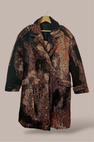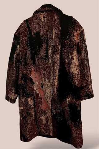 Abrigo largo de color marrón con patrón otoñal. Es de la nueva colección invierno 2025 de la marca Desigual en colaboración con Christian Lacroix y está nuevo con etiqueta.