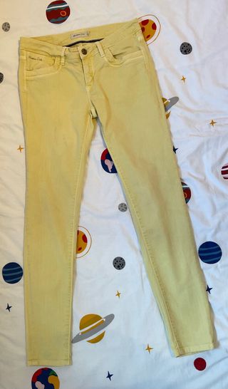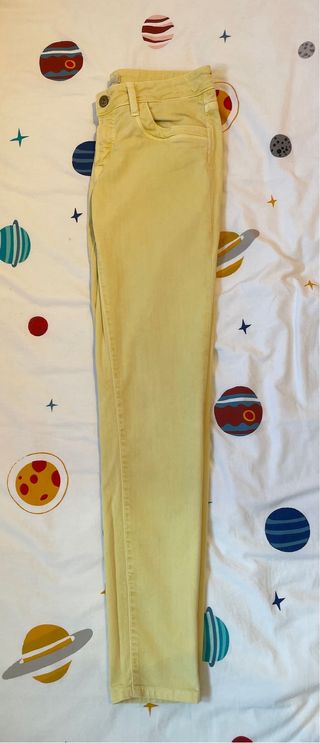 Pantalón de chica en color anarillo de la marca Massimo Dutti, en talla 38 y estilo pitillo. Esta en buen estado, pero tiene una mancha en una pata del pantalon que no se aprecia mucho (adjunto foto). Precio negociable.