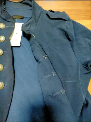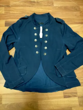 Chaqueta nueva de estilo militar en color azul, talla L. Tejido ligero y elástico. Se cierra mediante corchetes. - Cierre cruzado con botones. - Cuello mao. - Dos bolsillos frontales con solapa.